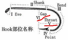 | これらは部位の形ではなく、深さ・幅で表現される。 広すぎても、深すぎても、 ポイントが曲がり易くなってしまうので、シャンクの太さや、 シャンクの断面、はたまたベンドの形とも 密接な関係がでてくる。 ゲープが広過ぎてもファールフッキングを誘ってしまう。 スロートが深すぎるても魚へのダメージが 大きすぎてしまう。 |